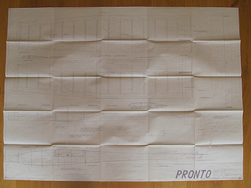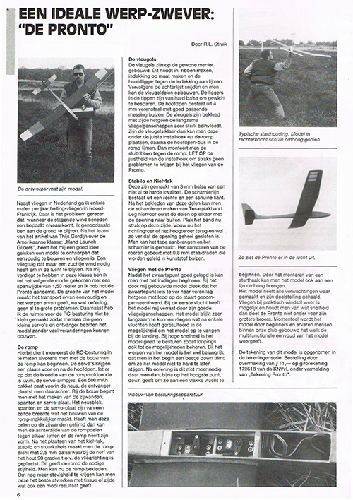 Maar terug naar de ideale werpzwever. Deze zwever heet Pronto en is ontworpen door Raymond Struik. Geen onbekende in de modelbouwwereld. De tekening heb ik dus besteld in 1991, maar gebouwd heb ik het model nooit. Dus ik dacht in augustus 2015: Doe eens gek, bouw hem alsnog. Stelt qua materiaal en constructie niet veel voor en je krijgt er waarschijnlijk veel plezier voor terug. Dus tussen al het Almost Ready to Fly (ARF), Receiver Ready (RR), piepschuimtroep en DLG's (tegenwoordig ą 900,- Euro) door gaat deze knutselaar zelf iets bouwen! Ja, ze zijn er nog!